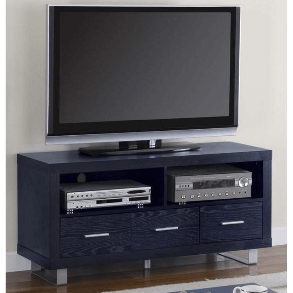 The 700644 TV Stand In Black By Coaster Furniture features 2 shelves and 3 drawers with metal accents.