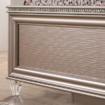 This bedroom set from the Allie Collection is one the kids can grow with. The padded headboard is upholstered in a pleated fabric or leatherette, and includes a reading light. The rose gold or pearl white finish, classic Contemporary Rose Gold Fabric, Acrylic, Solid Wood, Others Acrylic and Mirror Accents Padded Fabric Headboard w/ Radial Pleats and LED Light English Dovetail Drawers with Ball-bearing Metal Side Glides Felt-lined Top Drawer Mirror w/ LED Light Optional Convertible Trundle/Drawer Slat Kit Included