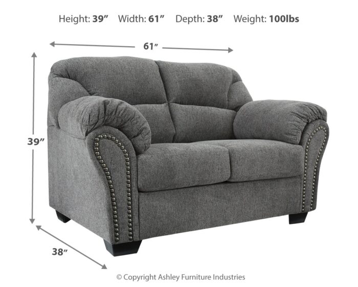 Why sacrifice comfort for style (or style for comfort) when you can have the best of both in this loveseat in pewter gray. Elements include a chic divided-back design and pillow top wrapped armrests that make nodding off all too easy. Calling attention to the elegantly flared armrests—black nickel-tone nailhead trim for a punch of cool character. Dimensions: 61”W x 38”D x 39”H Assembly Instructions: https://www.ashleydirect.com/GraphicsVault/Assembly_Instr/ShippingCleatRemoval_18412.pdf
