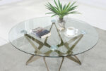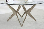 This industrial design is one-of-a-kind, allowing for an open and striking silhouette. Holding up the tempered glass top is a V-shaped base made of stainless steel. Paired with a neutral palette and pops of accent colors, any contemporary space will appre Contemporary Champagne Steel, Glass, Others 8mm Tempered Glass Steal Metal Body Satin Plated