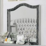 This camelback-designed mirror is the definition of decadent. A padded flannelette fabric and diamond-like button tufted headboard compliment this transitional design. Glam Gray Velvet-like Fabric, Solid Wood, Others Fully Upholstered Frame Button Tufted Crystal-Like Acrylic Buttons