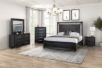 Contemporary Black Metal, Solid Wood, Acacia Veneer, Others Pinewood/Acacia Construction LED Headboard w/ Two Side 3-Dim Touch Switch Ball Bearing Metal Glide with Metal Leg and Hardware Beveled Mirror USB-A & USB-C on Nightstand Felt-lined Top and Cedarwood-lined Bottom Drawer on Dresser and Chest French Front and English Back Dovetail Drawers