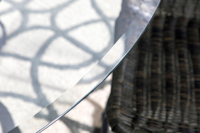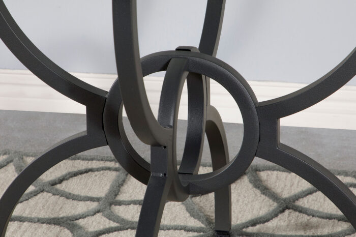 Aviano presents a contemporary dining masterpiece that’s truly captivating. The meticulously crafted metal table base boasts four curvaceous legs converging around an interlocking ring waist, adorned with a surprising gunmetal finish. Crowned with a 6mm 48″ diameter clear tempered glass, it seamlessly blends grace and modernity. Discover the allure of the transitional glass dining table, exuding casual charm. Its clear glass round elegantly rests on a captivating base with four stylized M legs, artistically interlocked in a ring motif and adorned with a rich gunmetal finish. At 30 inches, it’s the perfect addition for a chic breakfast nook or a stylish eat-in kitchen, infusing a touch of timeless elegance.