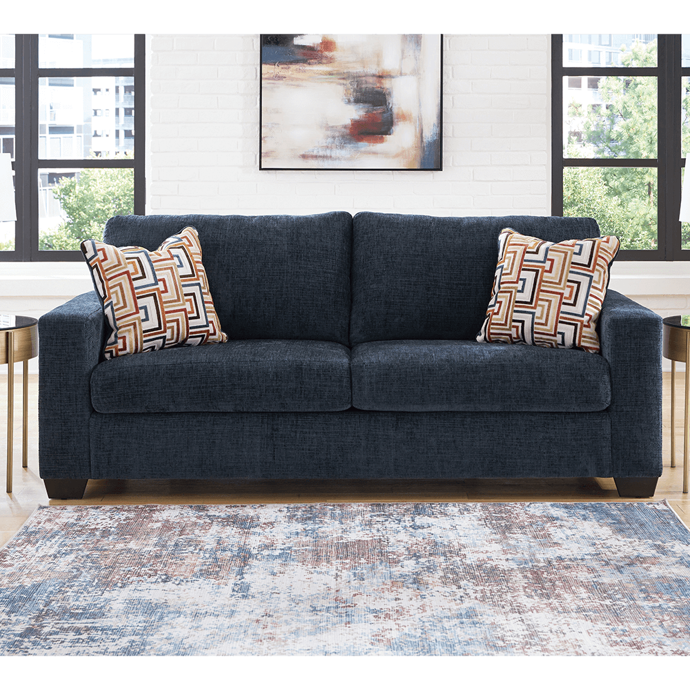 Looking to make a bold statement with color? Liven up your living room with the Aviemore sofa. Its trend-right navy blue upholstery adds a playful pop of color to your decor. Bold and eclectic accent pillows complete the look. Pairing posh style with everyday comfort, this piece is a welcome addition to contemporary spaces.