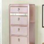 Resting atop elegant bun feet, this glamorous swivel chest brings a touch of stylish appeal that instantly brightens any space! Mirrored accent panels bring extra glitz to the design and make this a stunning piece to admire! Contemporary Rose Gold Mirror, Solid Wood, Wood Veneer, Others Mirror Trim Felt-lined Top Drawers Optional Swivel Chest w/ 5mm Beveled Mirror