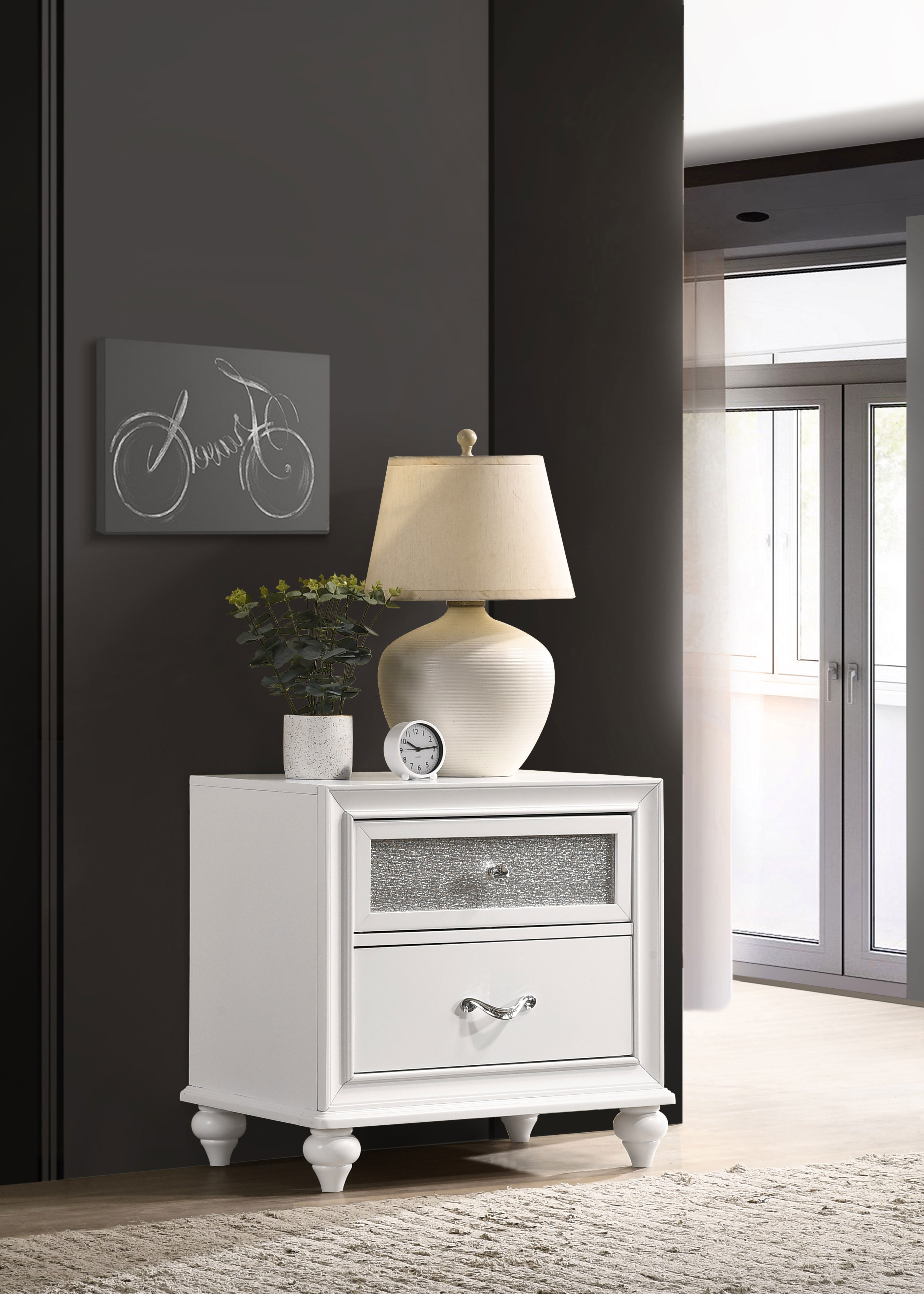 Bring a bit of glam and glitz into your personal space. This gorgeous, white nightstand is embellished with touches of sparkle to add a pop of pizzazz to any bedroom. The faceted crystal hardware glistens and gleams. The glittery acrylic panels sparkle and shine against the clean, classic white finish. Equipped with two drawers for your storage convenience, this stunning, modern nightstand keeps a bedside organized in style.