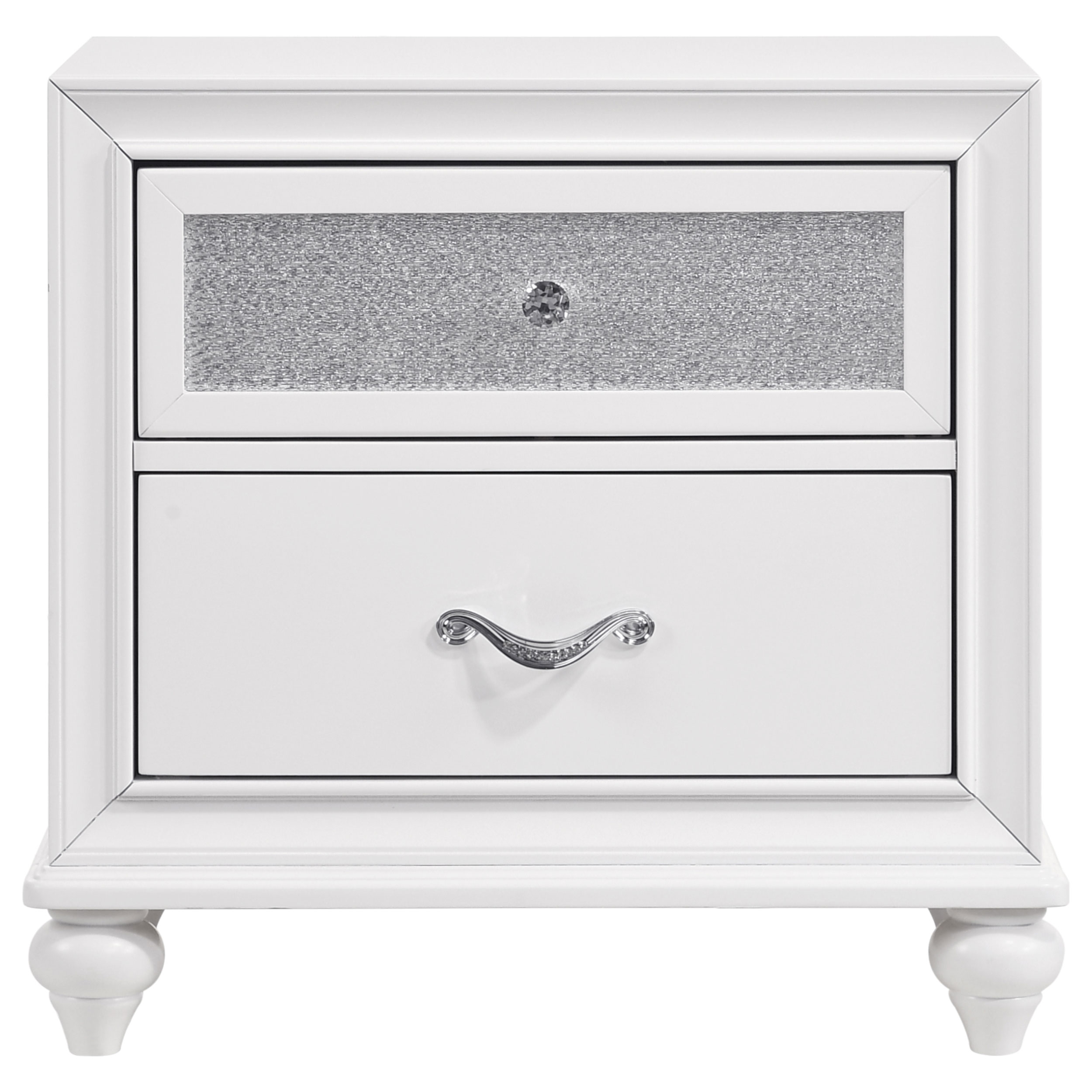 Perfectly suited for more transitional bedrooms, this four-piece bedroom set includes a panel bed frame, single two-drawer nightstand, and seven-drawer dresser with mirror, all in a crisp white finish with shiny metal hardware with faceted crystal accents. The paneled headboard and footboard offer channel tufted paneling wrapped in a metallic leatherette upholstery. Other extra touches include frame molding, turned feet, and felt lined top drawers. The nightstand offers a convenient power outlet for charging devices before bed. Place this bedroom set in a home to lend a more glamorous vibe.
