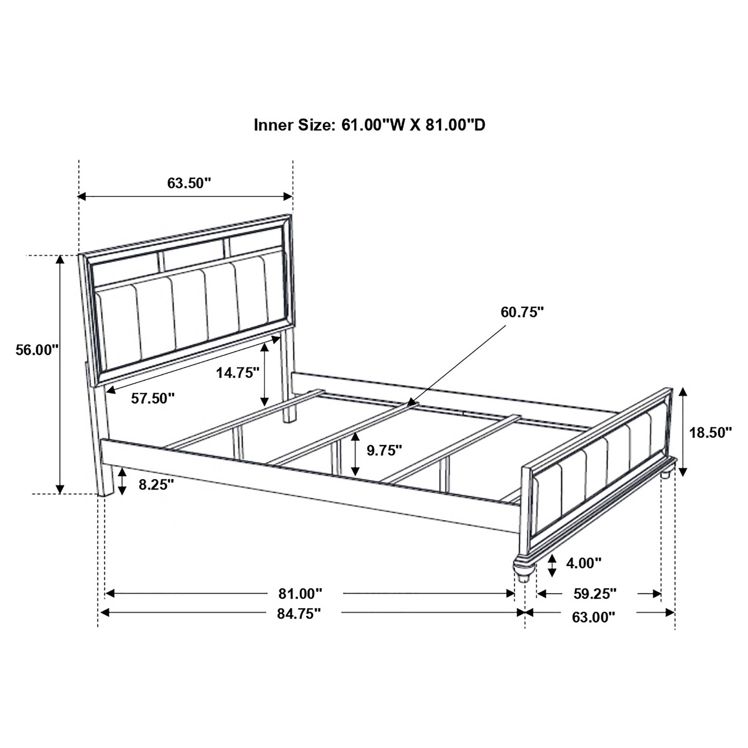 Perfectly suited for more transitional bedrooms, this panel bed features a tall panel headboard and footboard. With a white finished frame throughout, this bed offers extra touches such as channel tufted paneling wrapped in a metallic leatherette upholstery and sparkling accents. The white frame also features molding accents a well as turned feet on the footboard. Place this bed in a primary suite to lend a more glamorous vibe. This bed frame is available in several sizes as well.