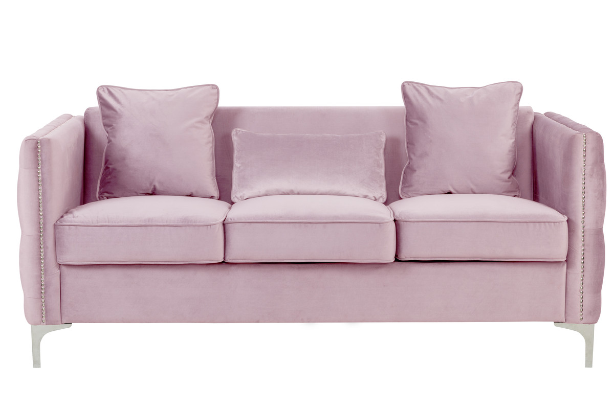 Tags: 10" Back Height, 20.5" Seat Height, 21.5" Seat Depth, 3 Throw Pillows Included, 62" Seat Width, 7" Seat Cushion Thickness, Chrome Metal Legs, Foam Filled Seats with Pocket Coil Springs, Handmade Button Tufted, Handmade Nailhead Trim, Non-removable Tight Back Cushion, Pink, Removable Loose Seat Cushion, velvet
