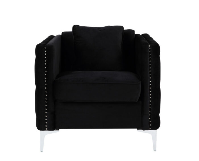 Tags: 20.5" Seat Height, 21.5" Seat Depth, 6 Throw Pillows Included, black, Chair measures 34"28.5"x30"H, Chrome Metal Legs, Foam Filled Seats with Pocket Coil Springs, Handmade Button Tufted, Handmade Nailhead Trim, Loveseat measures 53"x28.5"x30"H, Non-removable Tight Back Cushion, Removable Loose Seat Cushion, Sofa measures 73"x28.5"x30"H, velvet