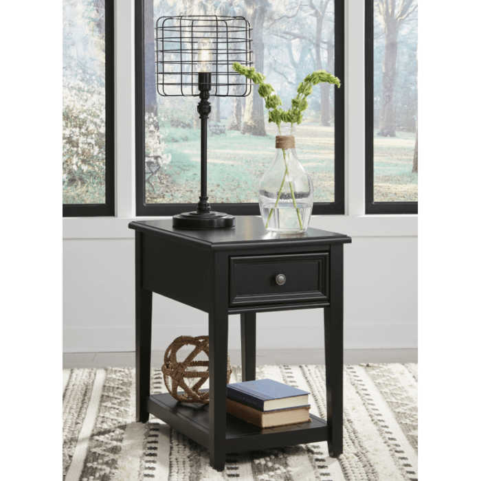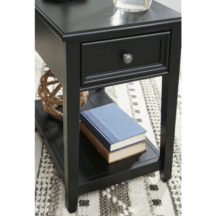 Keep chairside essentials within reach with the Beckincreek end table. The decorative drawer mouldings and tapered legs add an elegant look, while the open shelf and storage drawer help you achieve a carefully crafted clutter-free aesthetic.Made with solid wood components and MDF panelVintage black finishRound metal knobs with dark pewter-tone finishOpen lower shelfSingle smooth-gliding drawerAssembly required