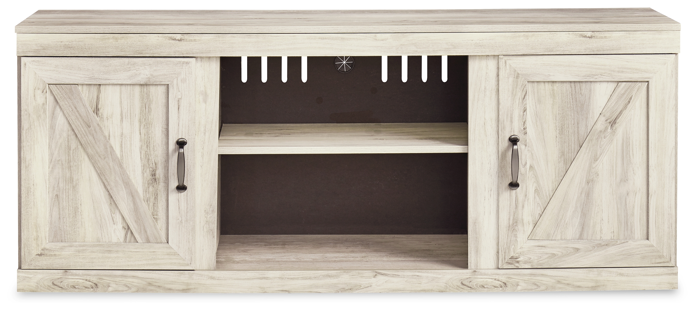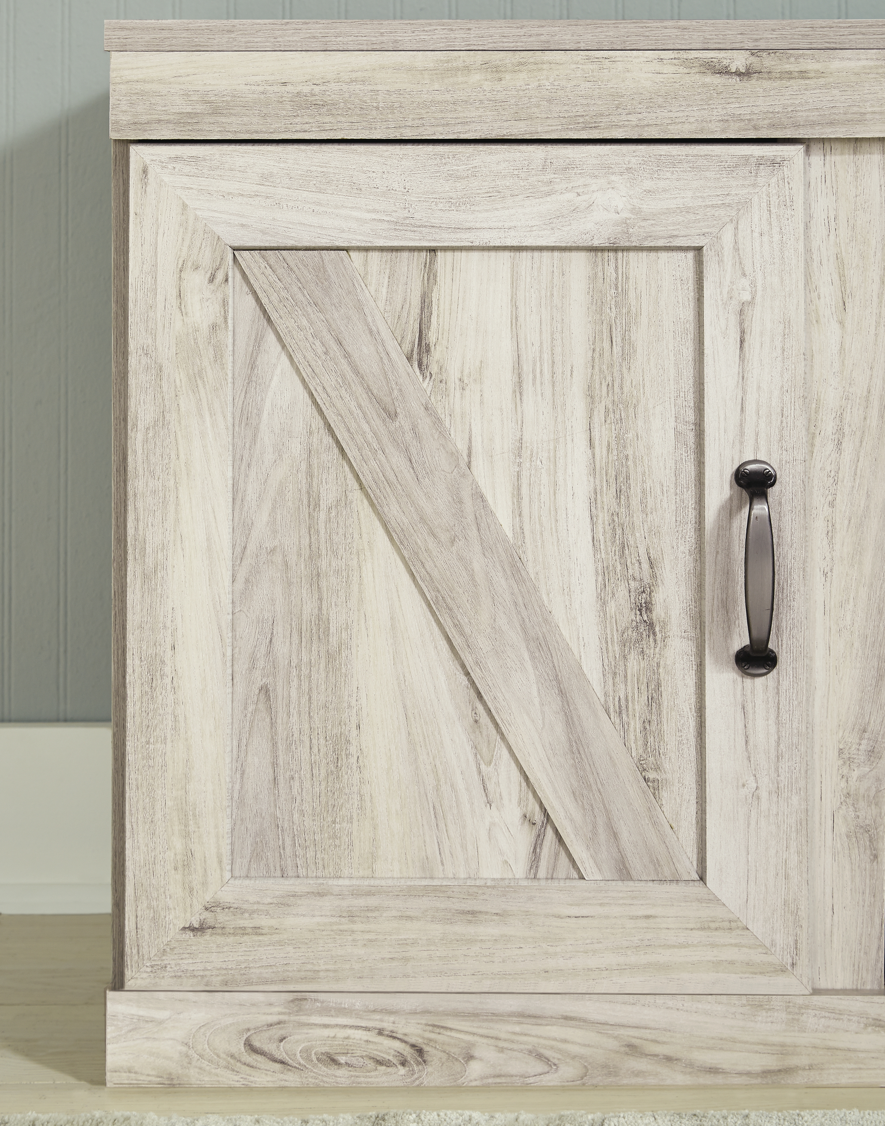 Express your modern farmhouse style with this TV stand with fireplace option. Its wispy white finish over replicated oak grain is a delightful change from the ordinary. Clean-lined, classic styling with barn door inspiration provides a country-chic aesthetic that’s a breath of fresh air. Dimensions: 60”W x 16”D x 25”H Assembly Instructions: https://www.ashleydirect.com/GraphicsVault/Assembly_Instr/10504584.pdf