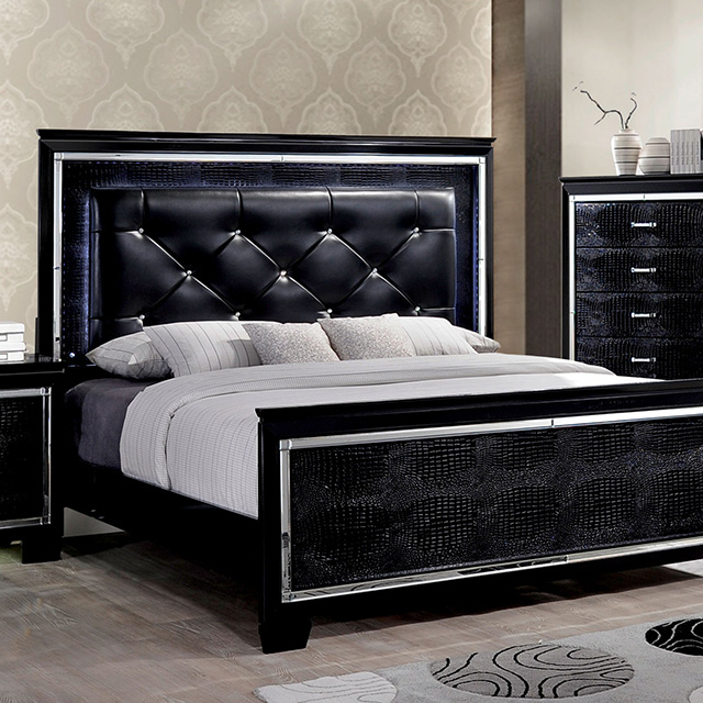 Specifically designed to accentuate a glamorous feel, this bedroom collection brings a combination of class and contemporary style to your bedroom. Crocodile embossed veneer and silver lining panels stand out throughout every piece while the button tufted Contemporary Black Mirror, Leatherette, Solid Wood, Wood Veneer, Others Crocodile-Textured Detail w/ 3mm Mirror Inserts Button Tufted Padded Headboard Diamond Crusted Bar Pull Handles LED Light on Headboard, Mirror, Night Stand English Dovetail Drawer Construction Foundation Required Felt-lined Top Drawers