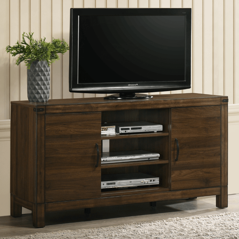 The Belmont 55″ TV Stand By Crown Mark features wood paneling and 2 sliding doors with shelves to hold all your entertainment equipment.