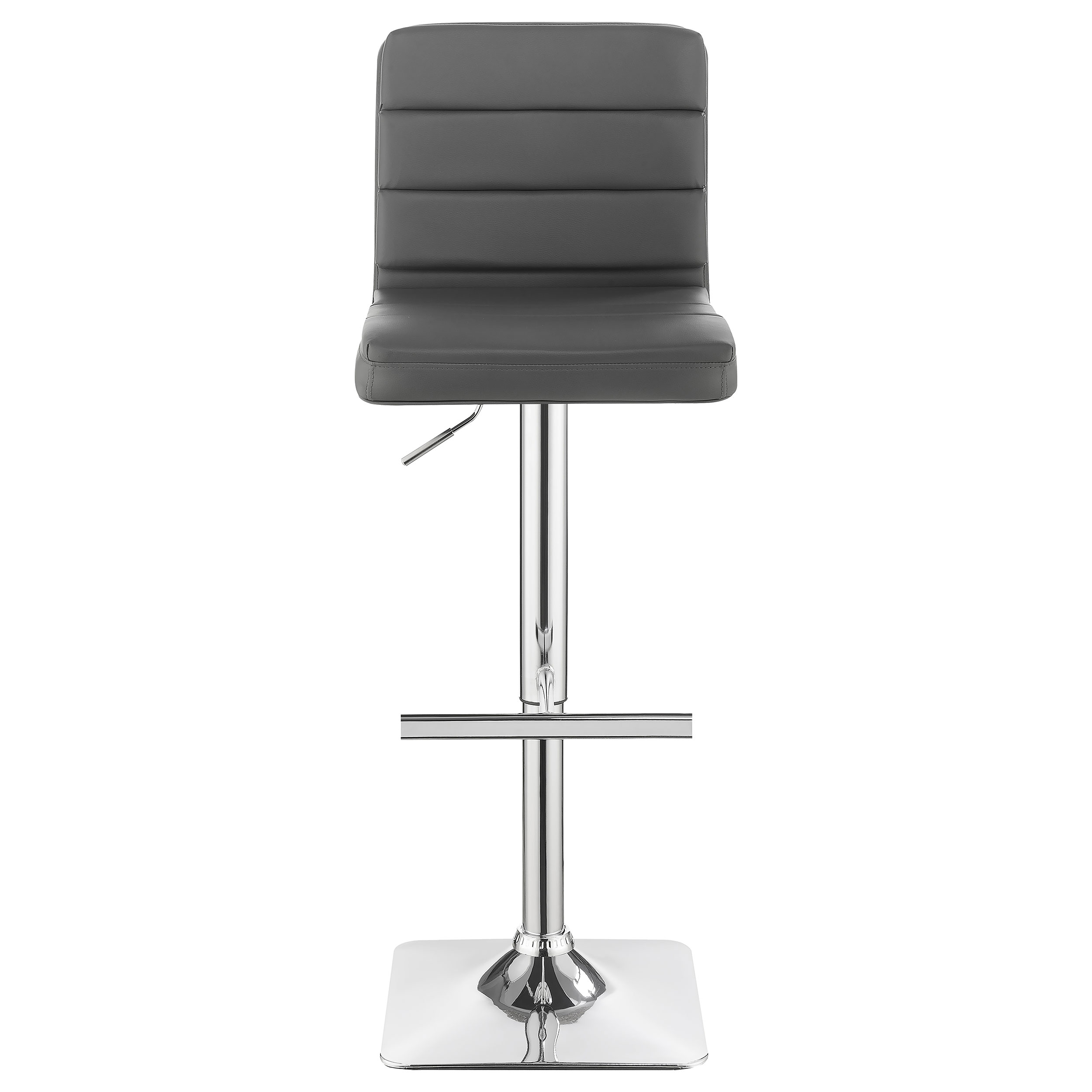 Chic grey leatherette cements the contemporary credentials of this adjustable barstool. Ideal for a home lounge or remodeled kitchen island, the stool features plush cushioning and a full back for ample support and comfort. A pedestal base boasts a square foot and built-in footrest. A chrome finish gleams and delivers a sleek, refined look. With a height adjustable seat, this stool complements modern bar tables and counters.