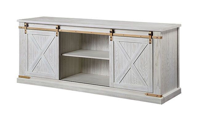 For those looking to add to their rustic abode, this TV console will fit right in. It comes in a beautiful farmhouse inspired design, with sliding doors and X front panels that take the ranch back into your living room. Rustic Antique White Metal, Solid Wood, Others Farmhouse Design Sliding Doors Multiple Open Shelves Metal Accents