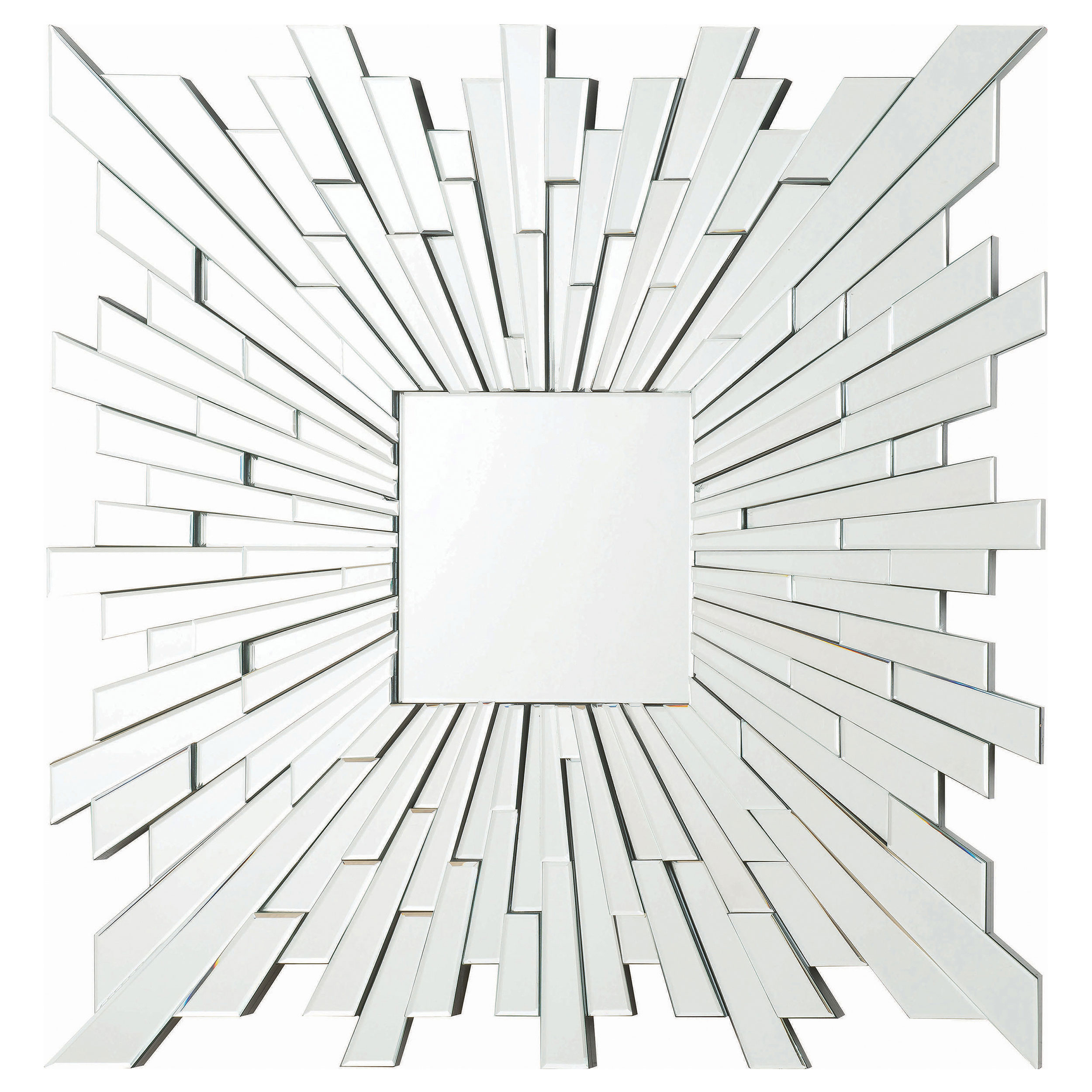 – Square starburst style clear mirror has a contemporary aesthetic – Staggered mirrored tiles surround the central mirror – Layers of mirrored tiles create texture and visual interest