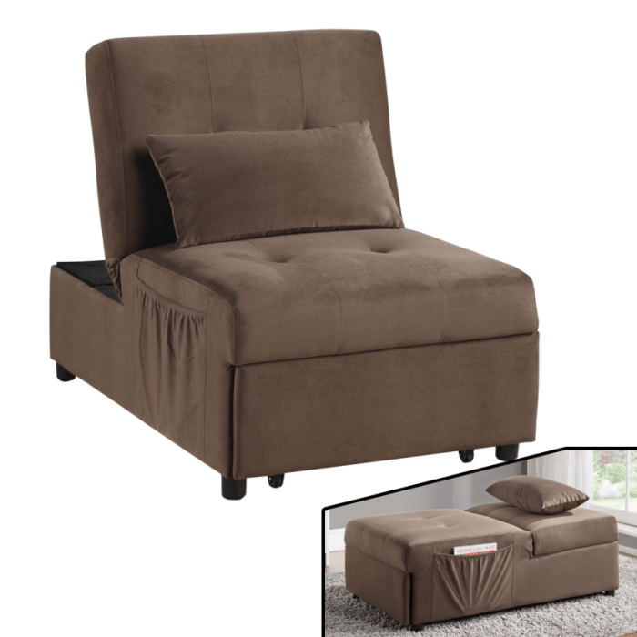 The convenience of the multi-functional Garrell Collection will add modern accent and functionality to meet the need for extra sleep space, storage and seating all in one cleverly designed bench. Half of the bench opens to reveal hidden storage, allowing for the raised portion to turn the bench into a seat. The pop-up unit allows for extension creating a convenient sleep platform that is fully engaged with the seatback returned to a flat position. A coordinating pillow is also included. Allowing for perfect placement within your decorative environment, the bench is offered in Brown velvet.