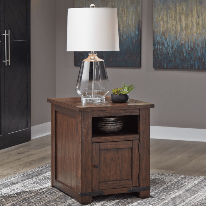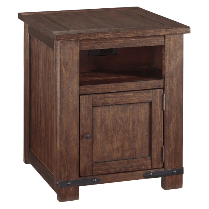 Rustic beauty and functionality ensue with the Budmore rectangular end table. Its farmhouse style garners attention with distressed rustic finish and black metal accents. You’ll love the extra room in the cubby and lower cabinet for stashing items. What’s more, a convenient AC power supply with two USB charging ports is located in the top of the cubby—perfect for keeping your cell phone or laptop charged without having to get up from your seat.