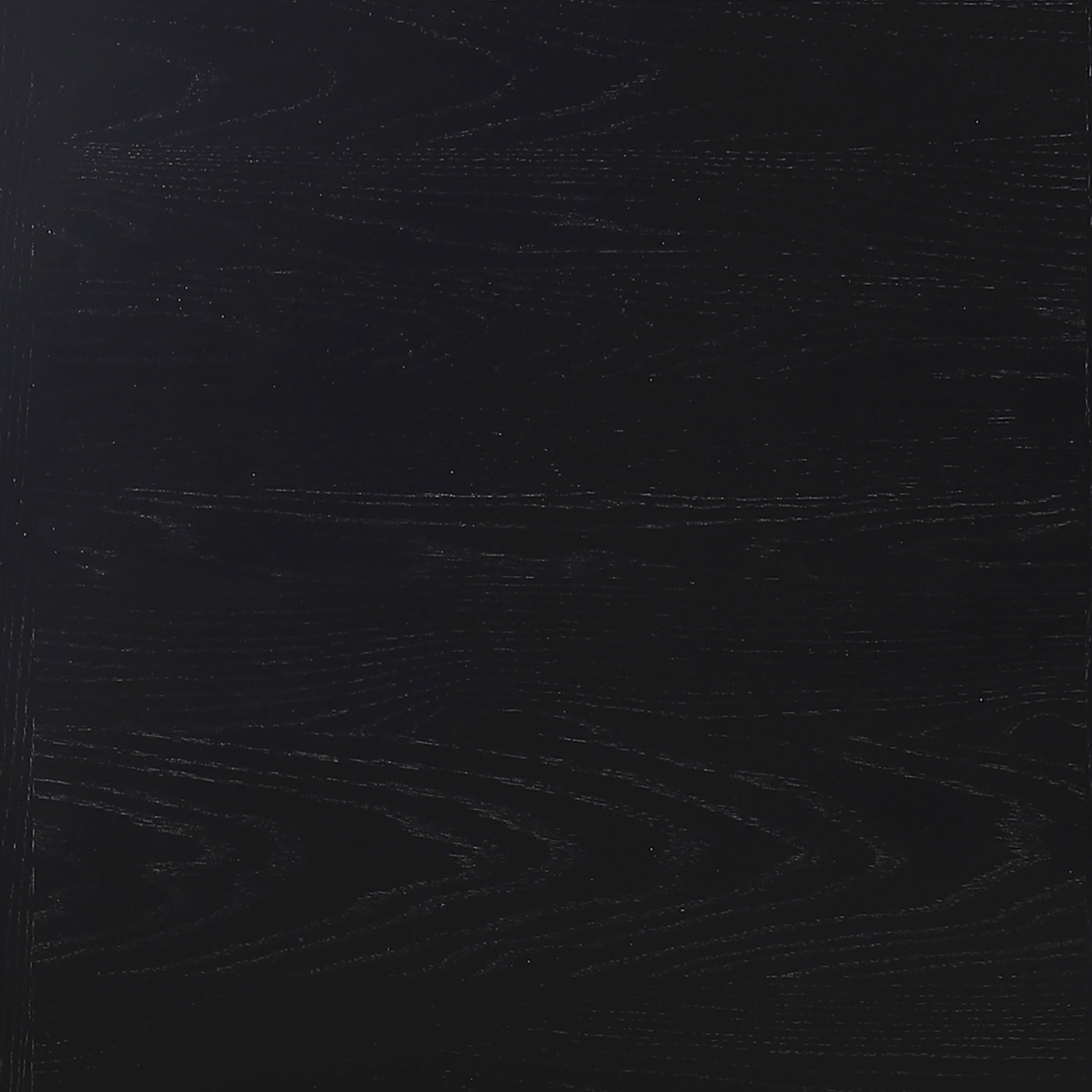 Introducing a beautiful dining room collection with clean, modern lines. The dining table boasts a oak veneer top with a black finish and a stunning tambour base design featuring fluted patterns on the double pedestal legs. The mid-century-inspired dining chairs have cushioned arms wrapped in durable charcoal grey fabric, offering comfort and style for any casual dining room.