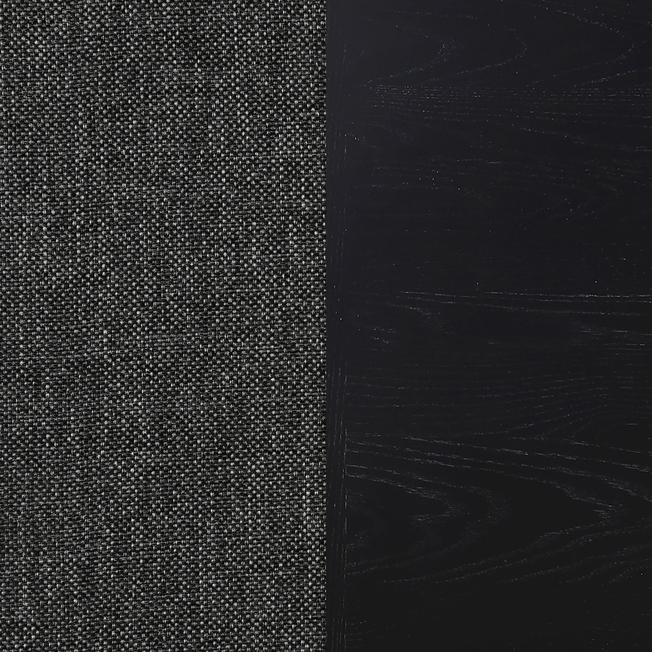 Introducing a beautiful dining room collection with clean, modern lines. The dining table boasts a oak veneer top with a black finish and a stunning tambour base design featuring fluted patterns on the double pedestal legs. The mid-century-inspired dining chairs have cushioned arms wrapped in durable charcoal grey fabric, offering comfort and style for any casual dining room.
