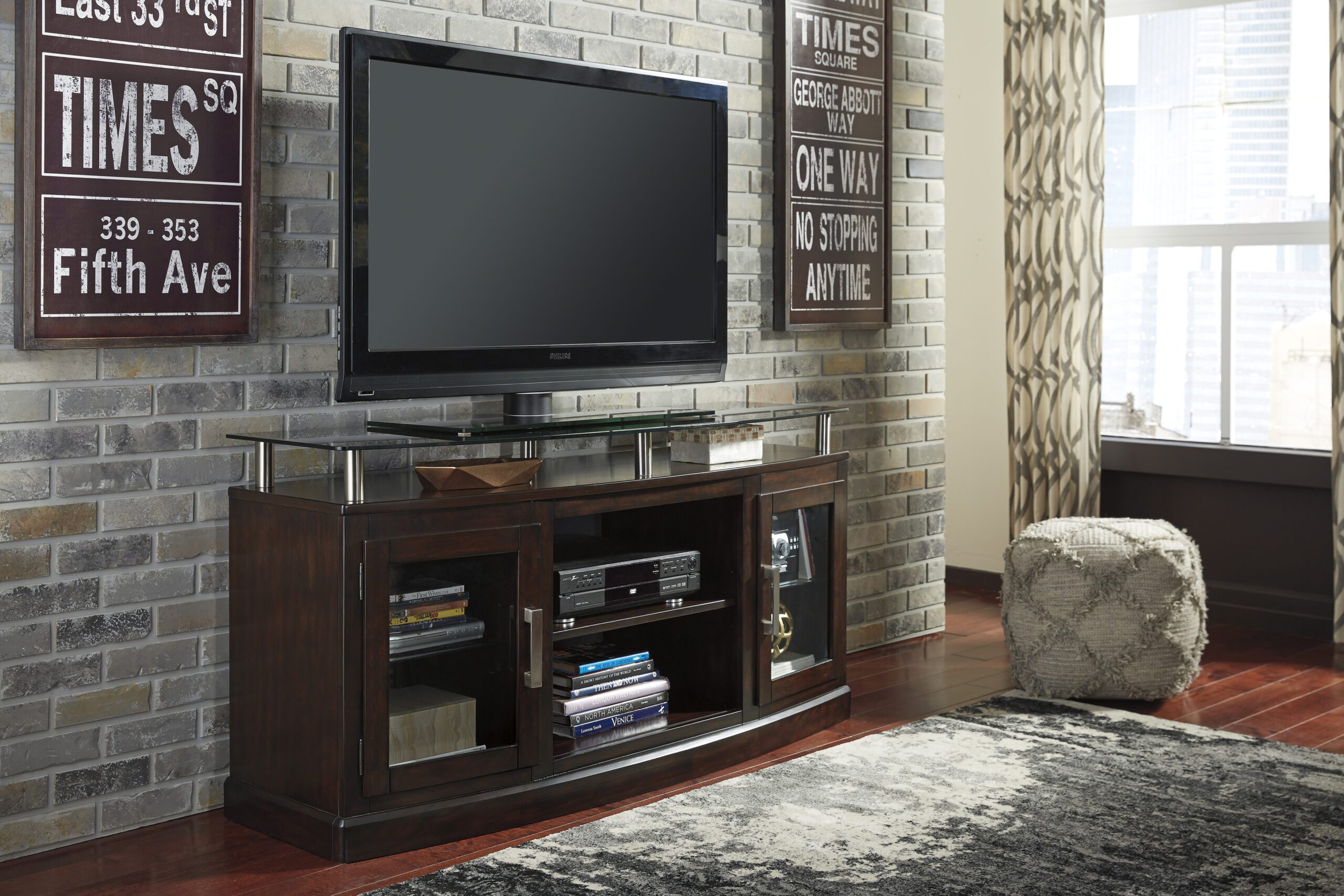 If you’re looking for an elevated take on contemporary style, you’re sure to appreciate this TV stand’s show-stopping good looks. Its “floating” black glass top brings that wow factor you’ve been yearning for. Other standout elements, including an arched front design, glass-front cabinets and architectural bar pulls give this TV stand a sleek sensibility and touch of drama.