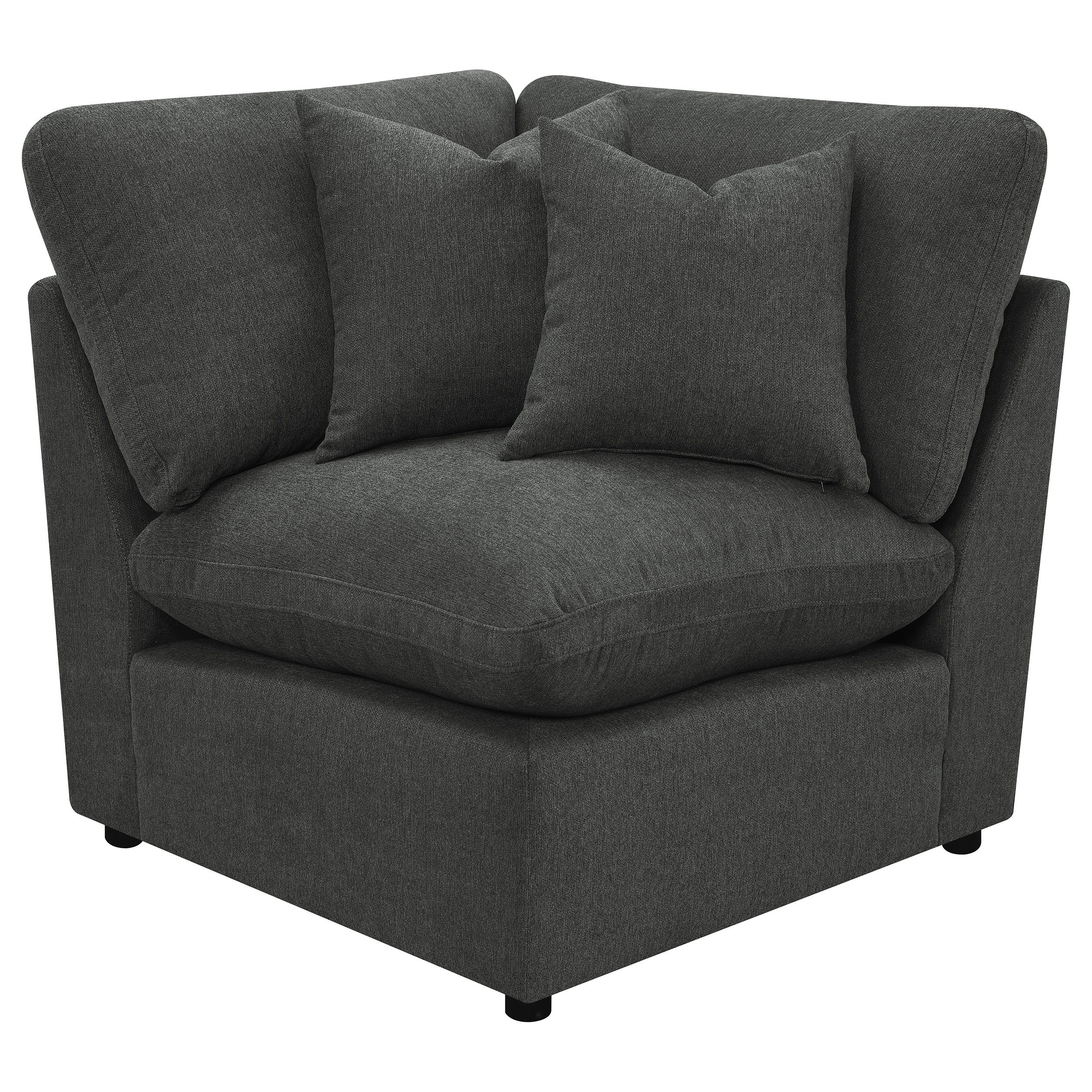 Convert your modular sofa into a sectional with the corner chair, designed to fit perfectly in any corner. This chair includes two plush pillows and features premium down-like filled cushions for a luxurious seating experience. The sleek, modern design enhances any decor, making it a perfect addition to your living space.