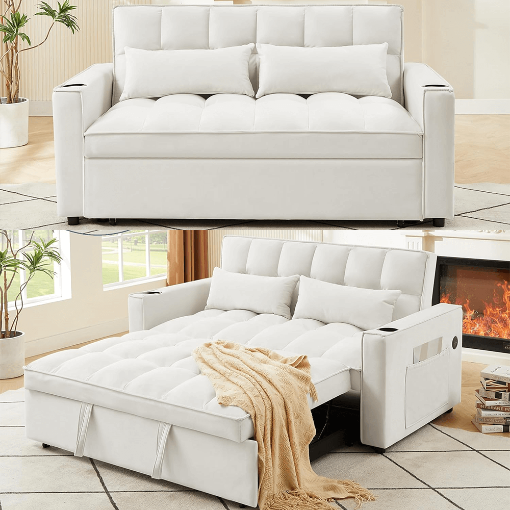 Convertible Velvet Sleeper Sofa Bed in Ivory By Simply Relax