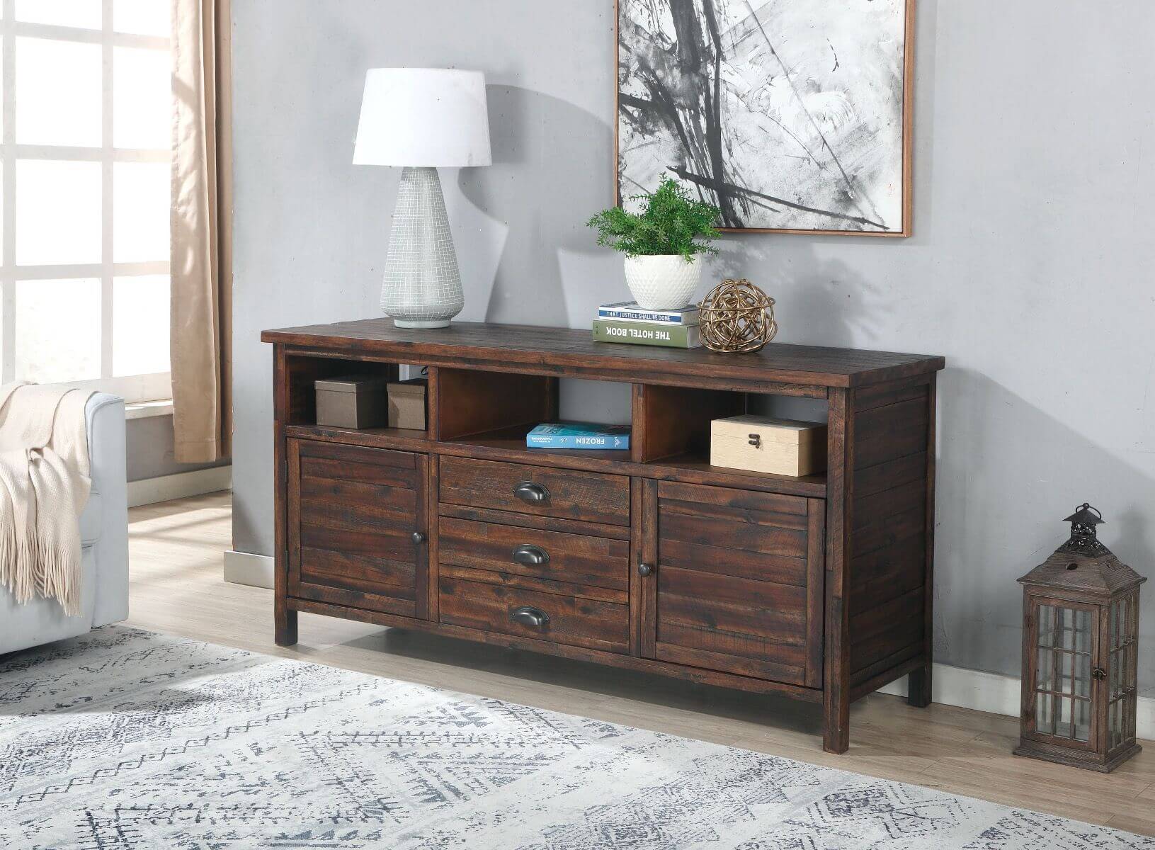 Our Country View 65″ TV Stand is available in 3 finishes at Vilo Home. Made of Acacias solids and veneers with distressed nickel finished knobs. The Country View TV Stand is an open concept top with 2 doors and 3 drawers on the base to easily store your belongings.