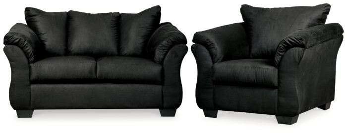 Talk about fine lines and great curves. That’s the beauty of this standout loveseat and chair set—made to suit your appreciation for clean, contemporary style. A striking flared frame, comfy pillow top armrests and an ultra-soft upholstery that holds up to everyday living complete this fashion statement. Dimensions: Assembly Instructions: