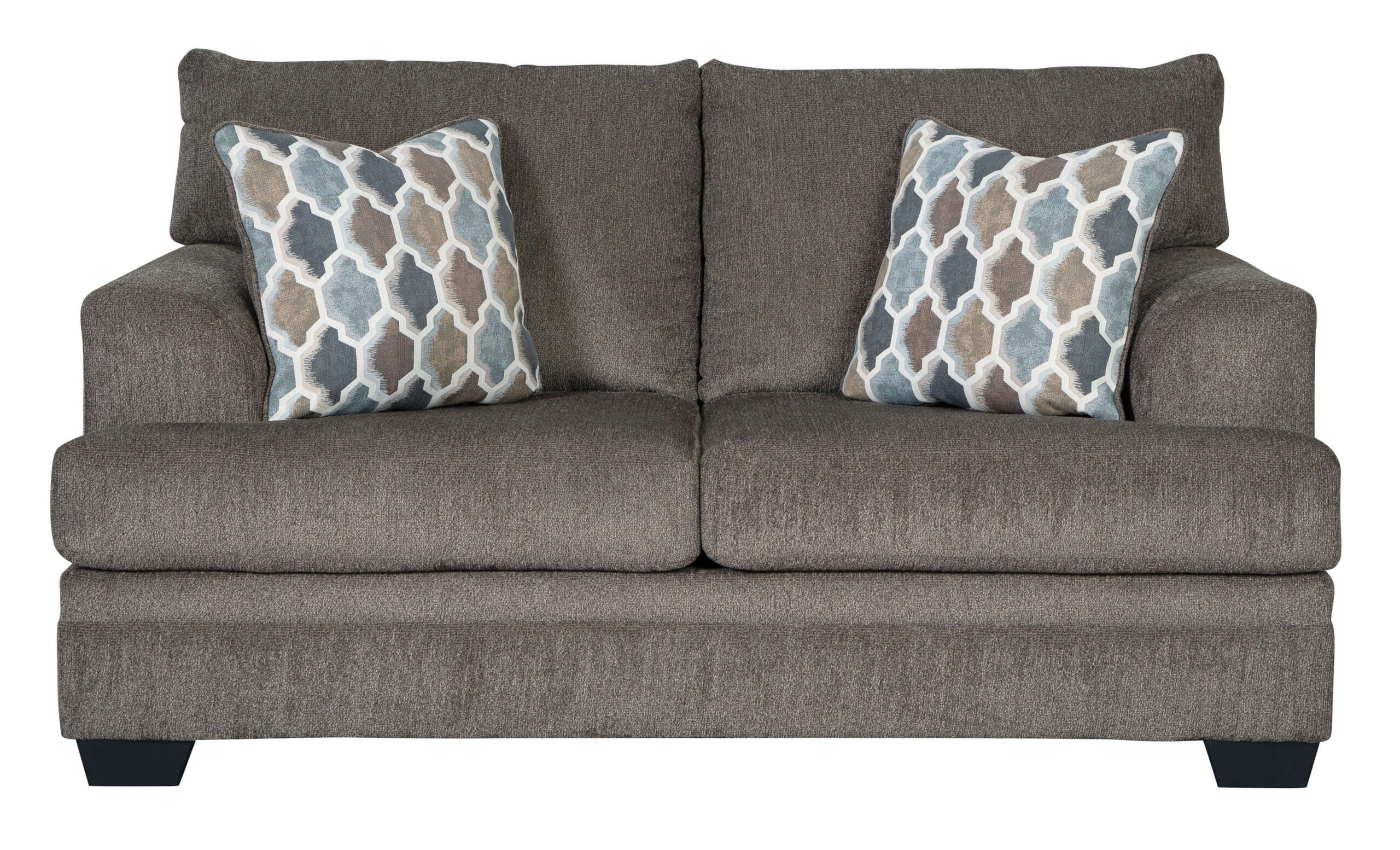 The contemporary Dorsten loveseat has comfort written all over it. From the plush cushions to the textured gray fabric, it’s a total winner for relaxation. The patterned throw pillows in blue, brown and tan complement the richly neutral upholstery.