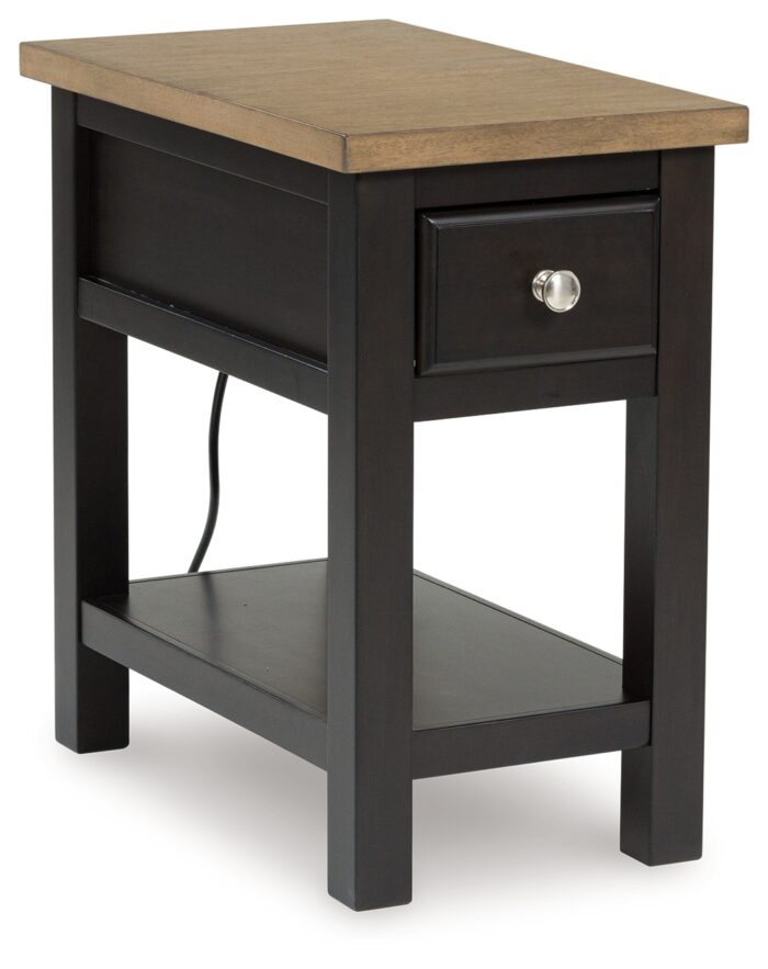 When you’re styling your living room, convenience is key. With this chairside end table, casual flair meets can’t-miss function. Tired of trekking to find a charger when your device is dead? This table’s built-in outlets and USB ports allow you to stay at ease in your favorite seat. The fashionably functional piece pairs a dark chocolate brown with a light wood tone, complementing a variety of color palettes. Dimensions: 14”W x 24”D x 24”H Assembly Instructions: https://www.ashleydirect.com/GraphicsVault/Assembly_Instr/T734-17_AIS.pdf