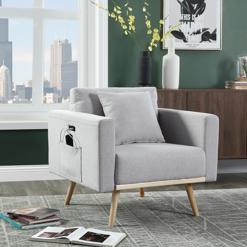 Tags: 1 Throw Pillows Included, 15" Seat Back Height, 18.5" Seat Height, 20.87" Seat Depth, 24.02" Seat Width, 24.8" Arm Height, 8.46" Leg Height, Full Foam Seat Cushion, Light Gray, linen, Natural Color Wood BottomTrim, Solid Wood Natural Color Leg, USB charging port on one side and magazine pocket on both sides