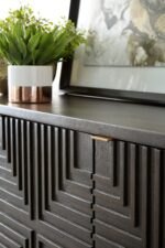 This accent cabinet is a versatile stunner with 3 geometric patterned door fronts in warm dark brown accented with goldtone finish metal hardware. Standing on a goldtone metal open frame base, the three-door console is aesthetically contemporary and sophisticated, ready to serve as buffet, console or media cabinet. Dimensions: 58”W x 16”D x 36”H Assembly Instructions: https://www.ashleydirect.com/GraphicsVault/Assembly_Instr/A4000316_AIS.pdf