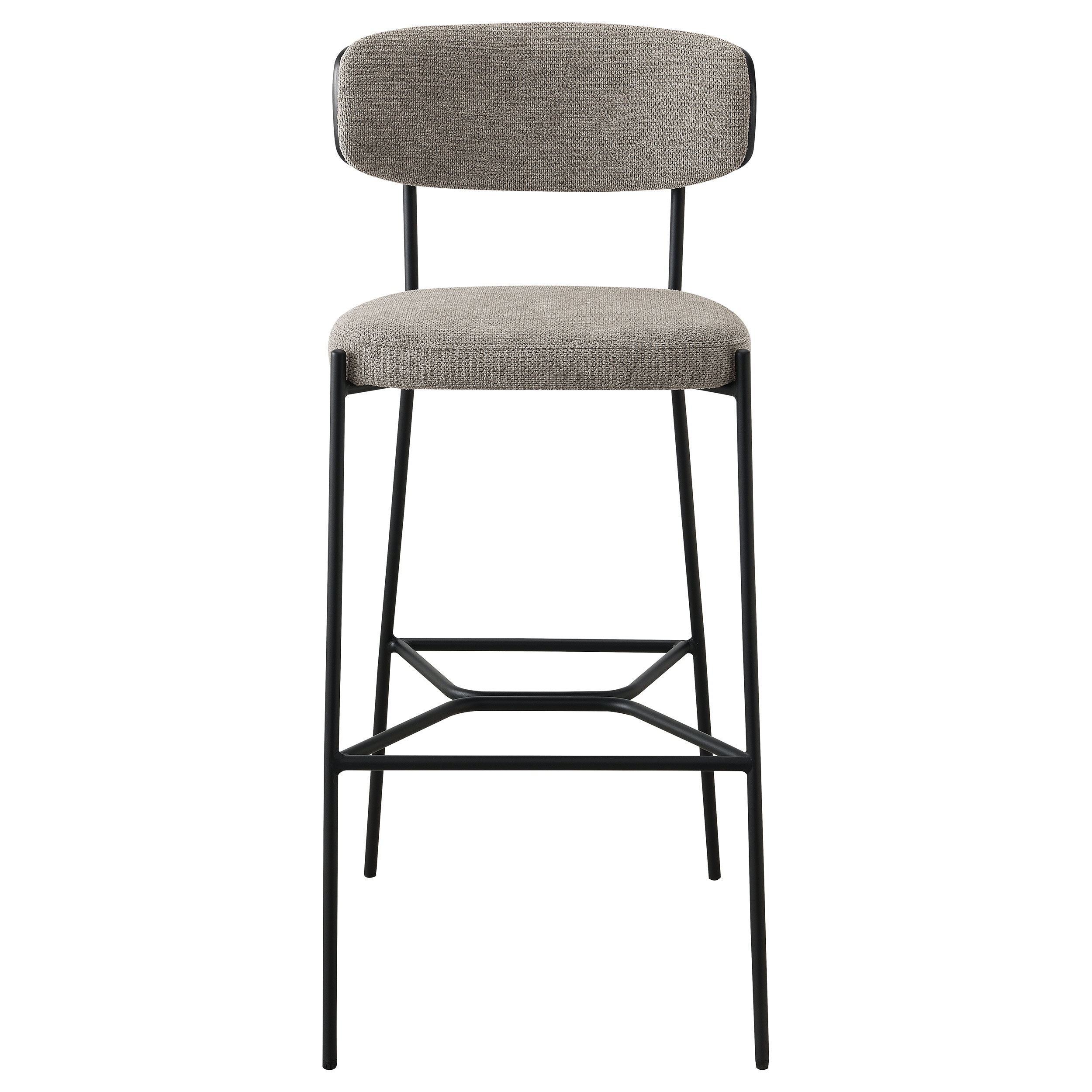 Create a relaxed and inviting ambiance at a kitchen bar or in your home lounge with a set of two modern barstools. Each boasts a durable and strong metal frame with a sandy black finish. Dark oak finish backrests complement neutral upholstery, offering foam cushioning that offers welcome comfort for family and friends. Slim structure ensures a crisp, modern silhouette for each barstool. Geometric details create a built-in footrest, perfect for leisurely enjoyment.