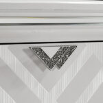 The enticing combination of glamour and Art Deco has long been attempted, but rarely with such successful results as achieved with this set. It is a visual masterpiece, harkening to the days of Old Hollywood while establ Contemporary White Leatherette, Solid Wood, Others LED Lights in Headboard and Mirror Padded Headboard Embossed Art Deco Pattern Hiddden Jewelry Drawers Acrylic legs USB Charger behind Night Stand