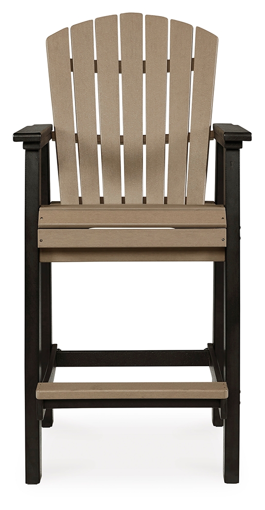 Raise the bar on outdoor living with this bar stool set. Crafted for style and durability, it caters with sturdy armrests, an ample footrest, a high shell back and a waterfall wrapped seat for curvaceous comfort. Adding to its appeal: a standout two-tone look that pairs driftwood and black finishes for twice the interest, and a slatted design to easily shed rainwater. Dimensions: 27”W x 27”D x 52”H Assembly Instructions: https://www.ashleydirect.com/GraphicsVault/Assembly_Instr/P211-130_AIS.pdf