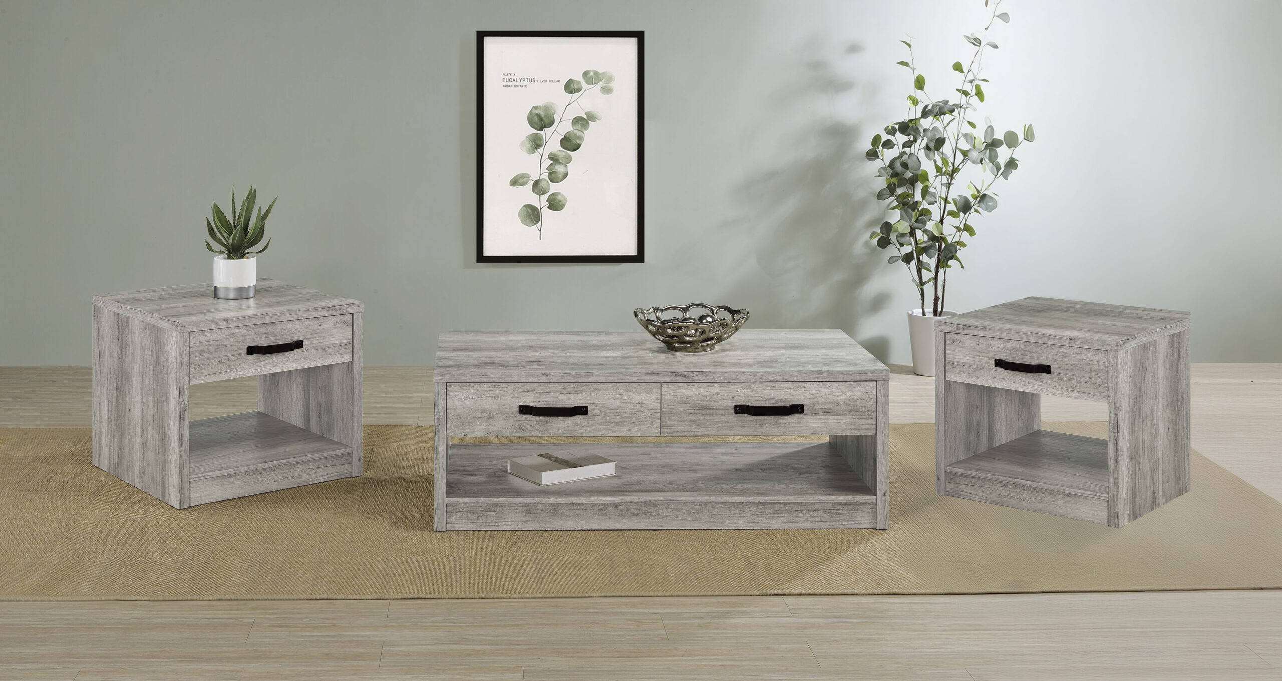 Create a cohesive look in your living space with this rustic coffee table set. Featuring a weathered gray wood-look finish, the set is crafted with engineered wood and scratch-resistant veneer for durability. Each piece includes clean lines, spacious storage drawers with bold black metal handles, and open shelves for additional display or storage. This set blends rustic charm and functionality, making it ideal for casual and modern interiors alike.