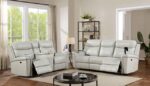 What sets this set apart are the convenience that it affords the user. For starters, each recliner moves with just a touch of a button. The chair is also a glider recliner; perfect for those quick afternoon naps. The built-in USB ports allow you to c Transitional Light Gray Leatherette, Others Power Recliner on Sofa and Loveseat USB Port Stainless Steel Cup Holders on Loveseat Storage Console on Loveseat Power Glider Recliner on Chair Removable Tray and Tablet Holder Nailhead Trim
