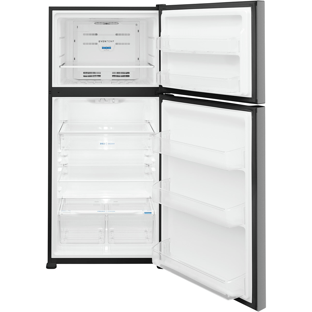 The Frigidaire 20 cubic foot top freezer refrigerator fits in the same sized cutout as a traditional 18 cu. ft. model. This refrigerator features the EvenTemp™ Cooling System, precise temperature control which keeps food at one ideal temperature. Spacious interior storage options include a full-width deli drawer, generous door bins, and a full-width glass freezer shelf.