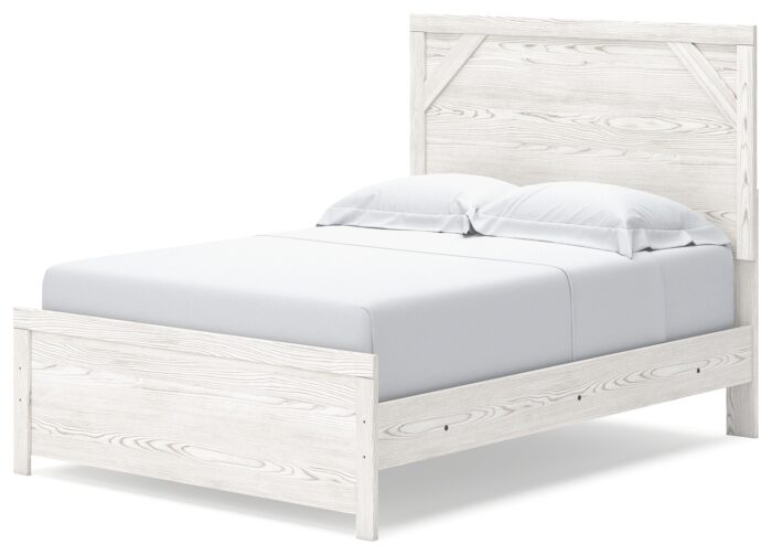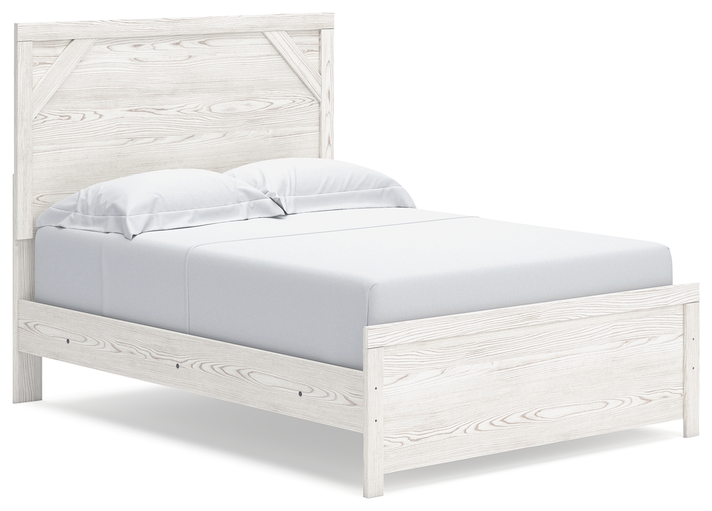 Cool, clean and casually modern. This full panel bed’s wispy whitewash finish sets the tone for your calming sanctuary. Framed elements and cross-brace accents add dimension and authenticity to the bed’s simply stunning profile. Dimensions: 57”W x 79”D x 53”H Assembly Instructions: https://www.ashleydirect.com/GraphicsVault/Assembly_Instr/175112.PDF|https://www.ashleydirect.com/GraphicsVault/Assembly_Instr/134917.pdf