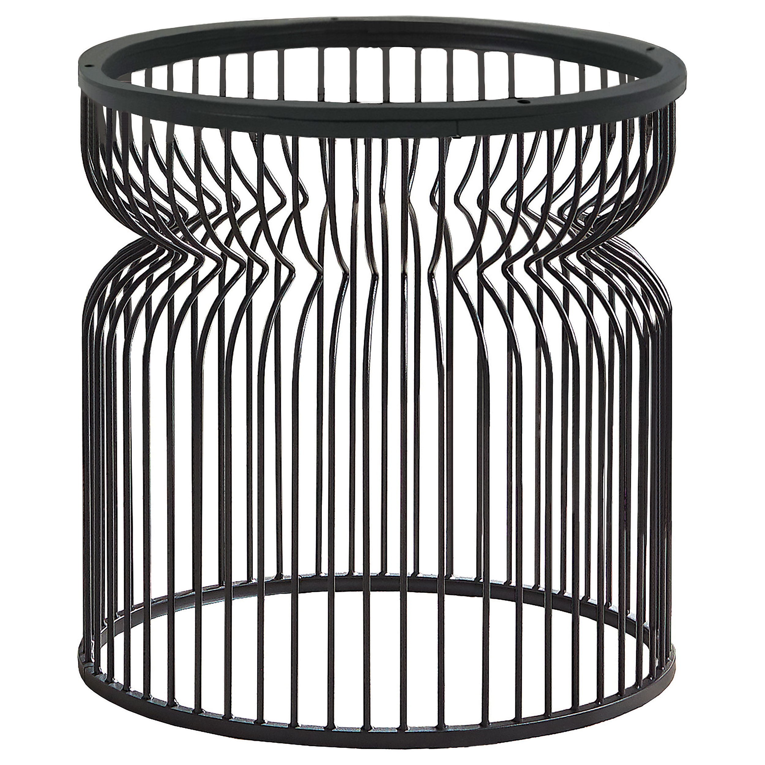 Add a bold foundation to your dining space with this cage-style dining table base in a gunmetal finish. Crafted from sleek metal rods, its sculptural hourglass shape offers both style and stability. The open design brings a light, airy feel, while the sturdy construction supports a range of tabletop options—from clear glass to marble. Create a personalized dining table that suits your unique aesthetic.