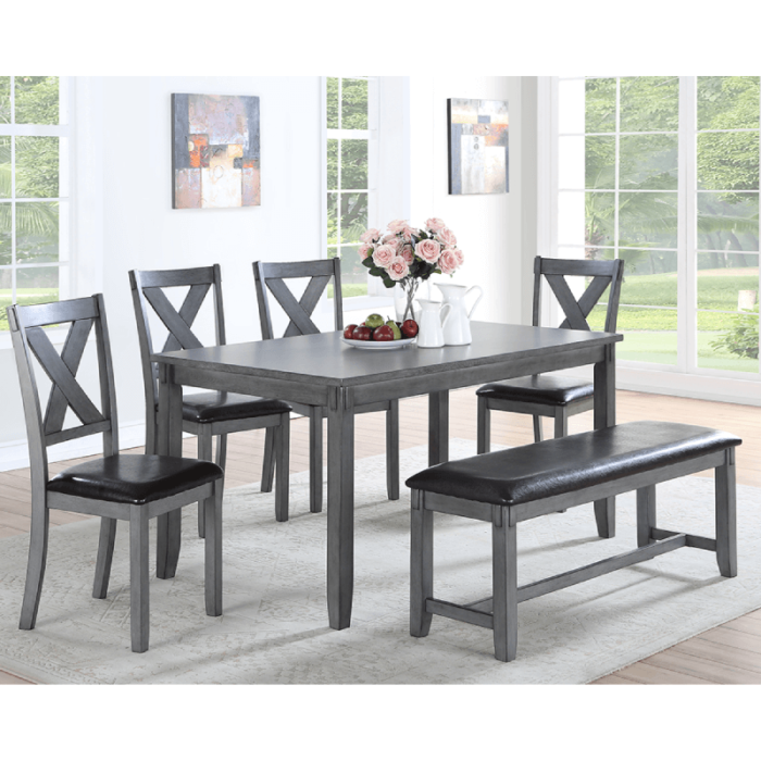 Made from natural wood with elegant grey finishing, this six pieces dining set is the perfect collection to add some personality into your kitchen or dining area. It includes four refined chairs with a X back design, and a sophisticated table that are big enough to hold plates of cuisine, and a dining bench for a more rustic look. All of the seatings have comfortable cushions that are designed for having a long dinner and relaxing time with your family.