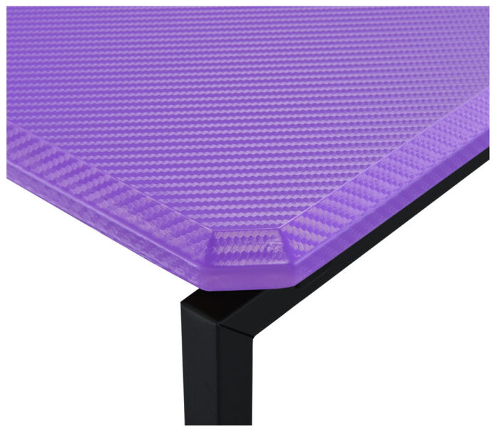Tags: 0.7" Tabletop Thickness, adjustable feet, Angled Corners on Tabletops, Beveled Edges, Carbon Fiber Wrapped Rectangular Tabletops, Coffee Table Dimension: 39.5"W x 19"D x 18.5"H, End Table Dimension: 19"W x 15.5"D x 21.5"H, Includes 1 coffee table and 2 end tables, Medium Density Fiberboard Tabletop, Metal Frame, Violet