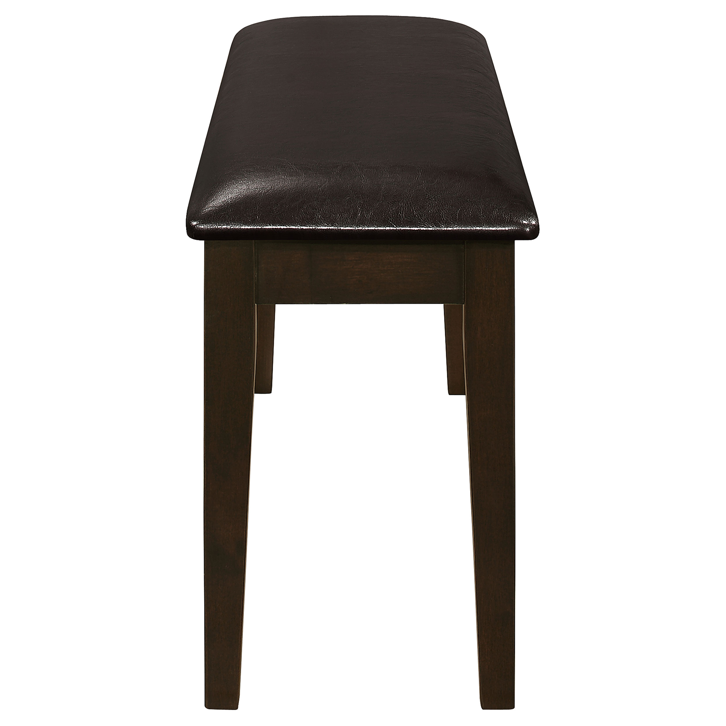 Be it everyday meals with the family or casually catching up with friends over wine in the dining room, this five-piece set is the perfect fit for your home. Crafted from Asian tropical hardwood and Okume veneer, the rectangular table boasts straight clean lines and bold tapered legs. Three chairs with comfy padded brown leatherette seats bolster the table, while the leatherette bench adds functionality. The classic details also add an element of tradition to any occasion. This ensemble is sure to be a foundation of fond memories.