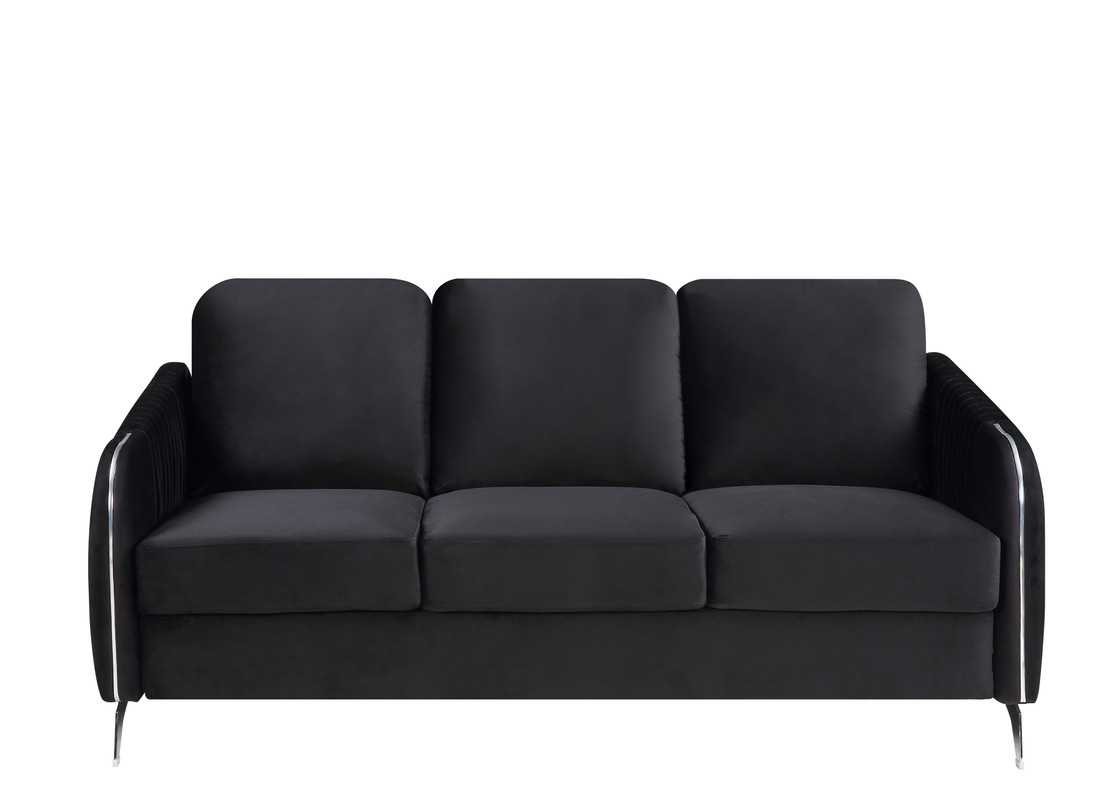 Tags: 18" Back Height, 19" Seat Height, 22.5" Seat Depth, 5" Leg Height, 68" Seat Width, 7" Seat Cushion Thickness, black, Chrome Metal Trim and Legs, Non-removable seat cushions, Pocket Coil Springs provide Cushion Support, Removable Back Cushions, velvet, Vertical Channel-Quilted Design