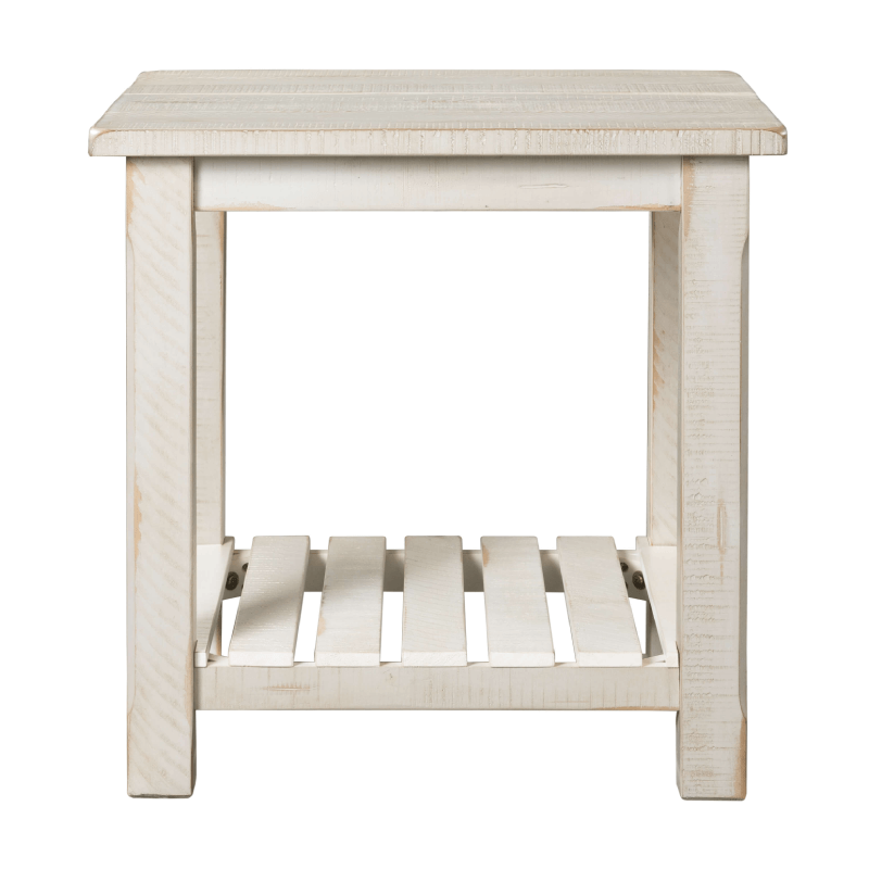 Home Barn This beautiful Farmhouse cottage-style End Table has rough-hewn saw marks that give it an elegant look and it has a shelf.