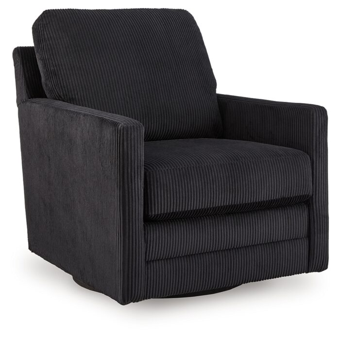 Clean-lined, contemporary style. Relaxed, homey comfort. This swivel chair has it all. Lightweight onyx-hued corduroy upholstery makes it a cozy yet head-turning piece. Factor in the 360-degree spin, and you’ve got a win-win. Dimensions: 30”W x 36”D x 36”H Assembly Instructions: