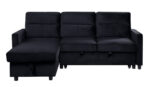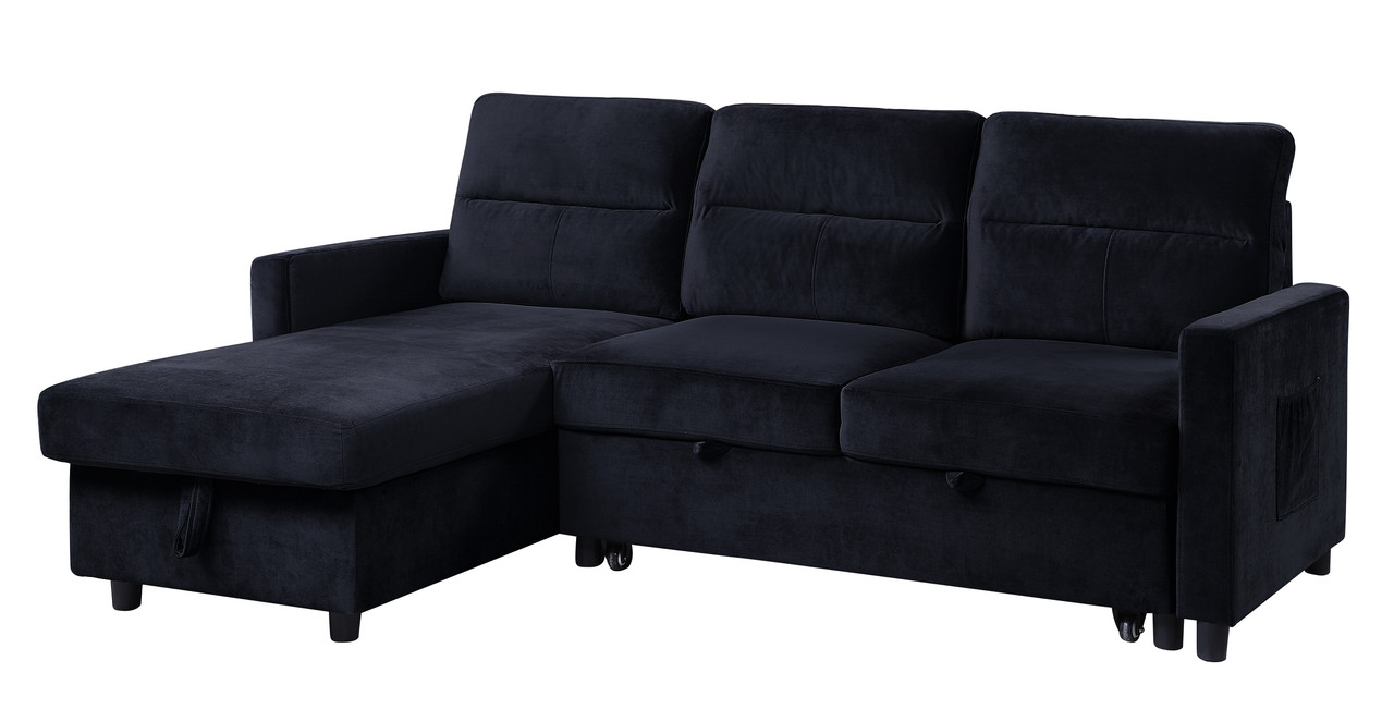Ivy 81.5″W Black Velvet Reversible Sleeper Sectional Sofa with Storage Chaise and Side Pocket – Lilola