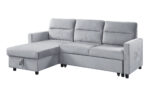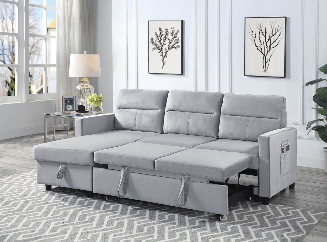 Ivy 81.5″W Light Gray Velvet Reversible Sleeper Sectional Sofa with Storage Chaise and Side Pocket – Lilola